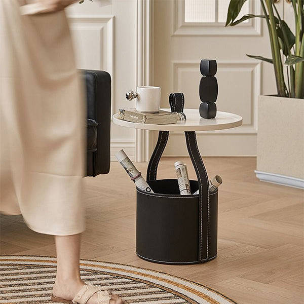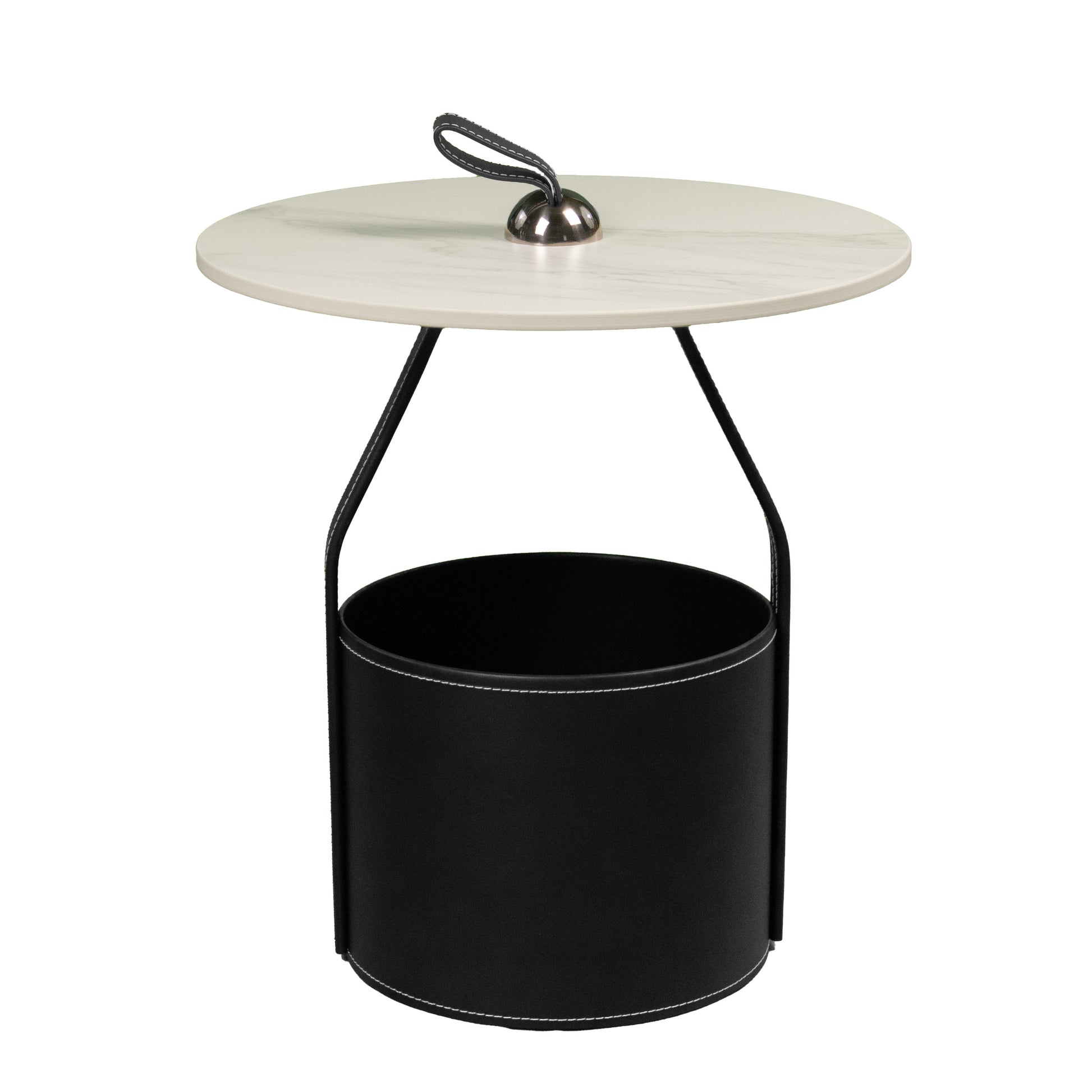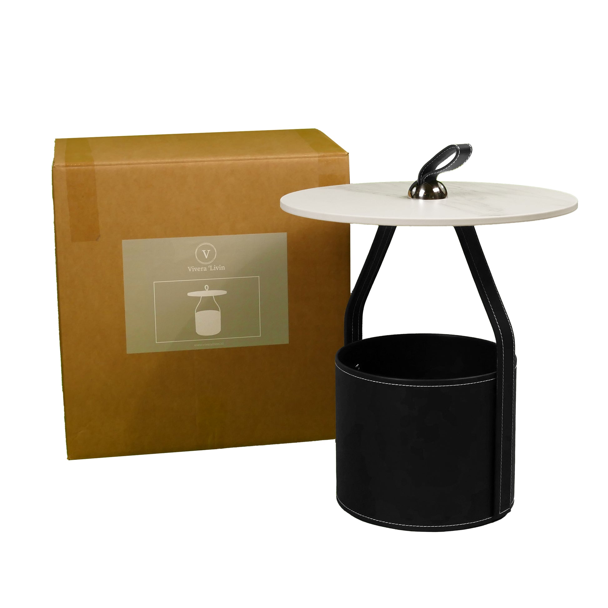 Bijzettafel met Stenen Blad - Zwarte Leren Mand
