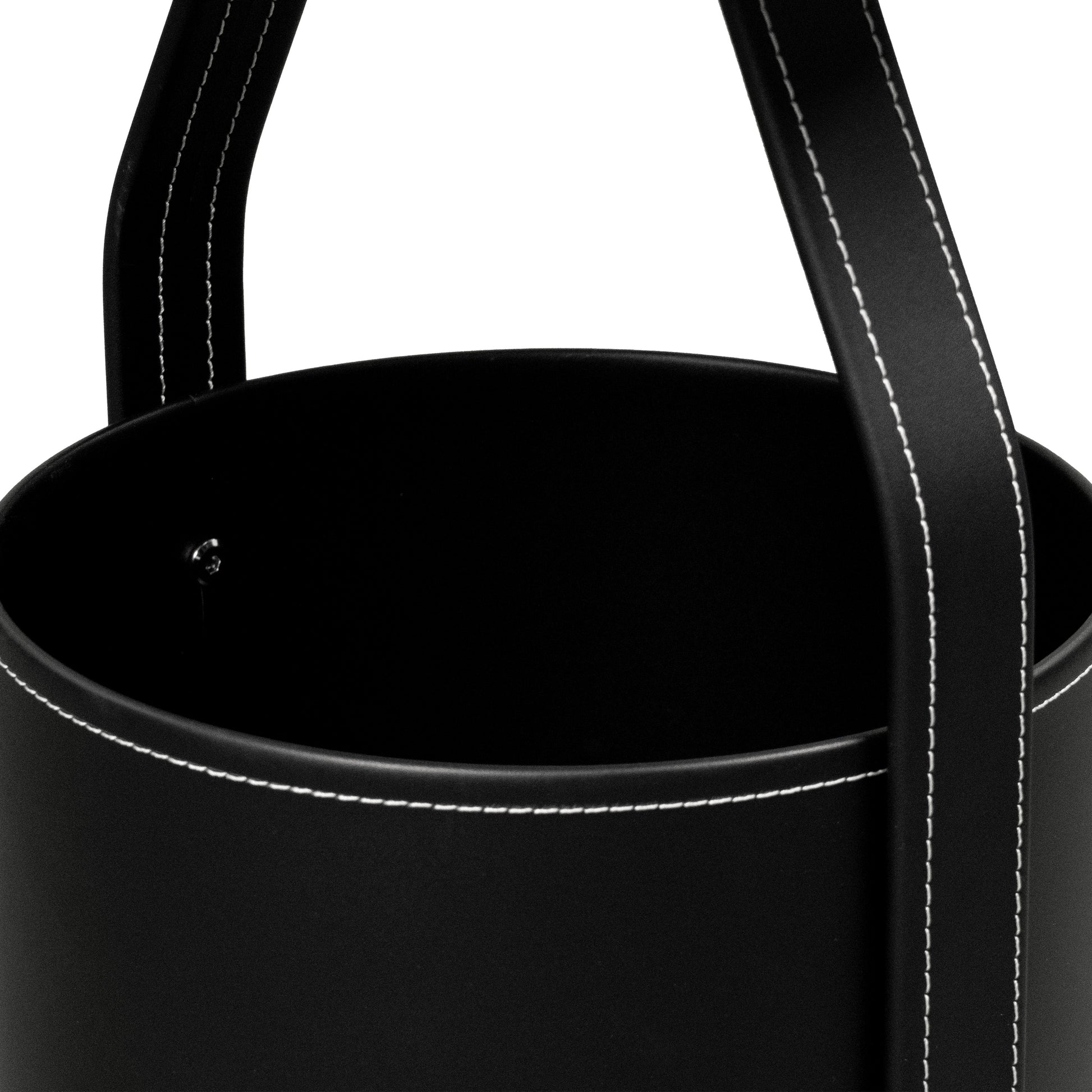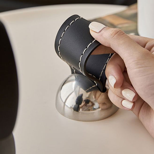 Deze elegante bijzettafel combineert een luxe stenen blad met een stijlvolle zwarte leren mand. Het contrast tussen de materialen geeft een moderne en verfijnde uitstraling die perfect past in diverse woonstijlen.