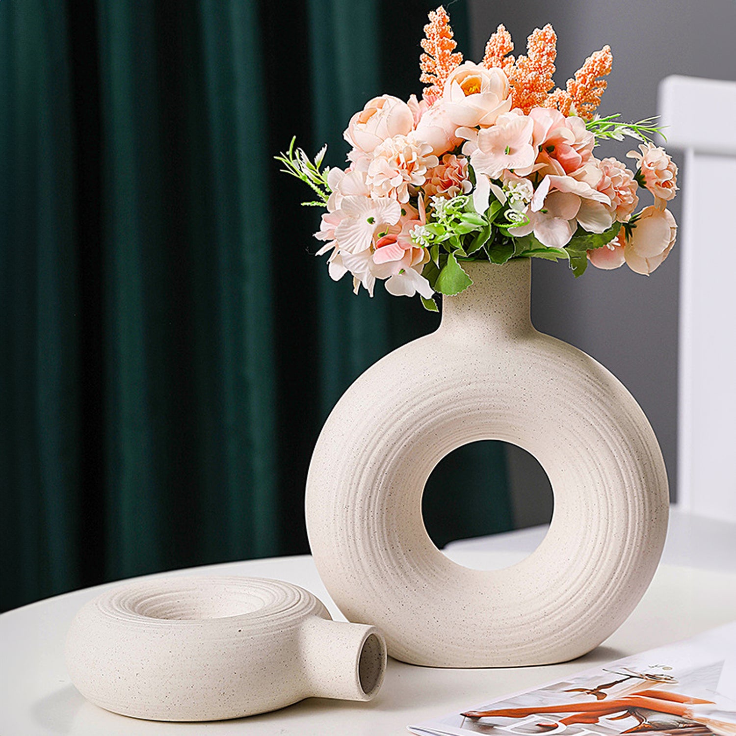 Deze moderne donut vazen set is een echte blikvanger in je interieur. De organische vorm en zachte crèmekleur geven een speelse, maar toch luxe uitstraling die perfect past bij diverse interieurstijlen.