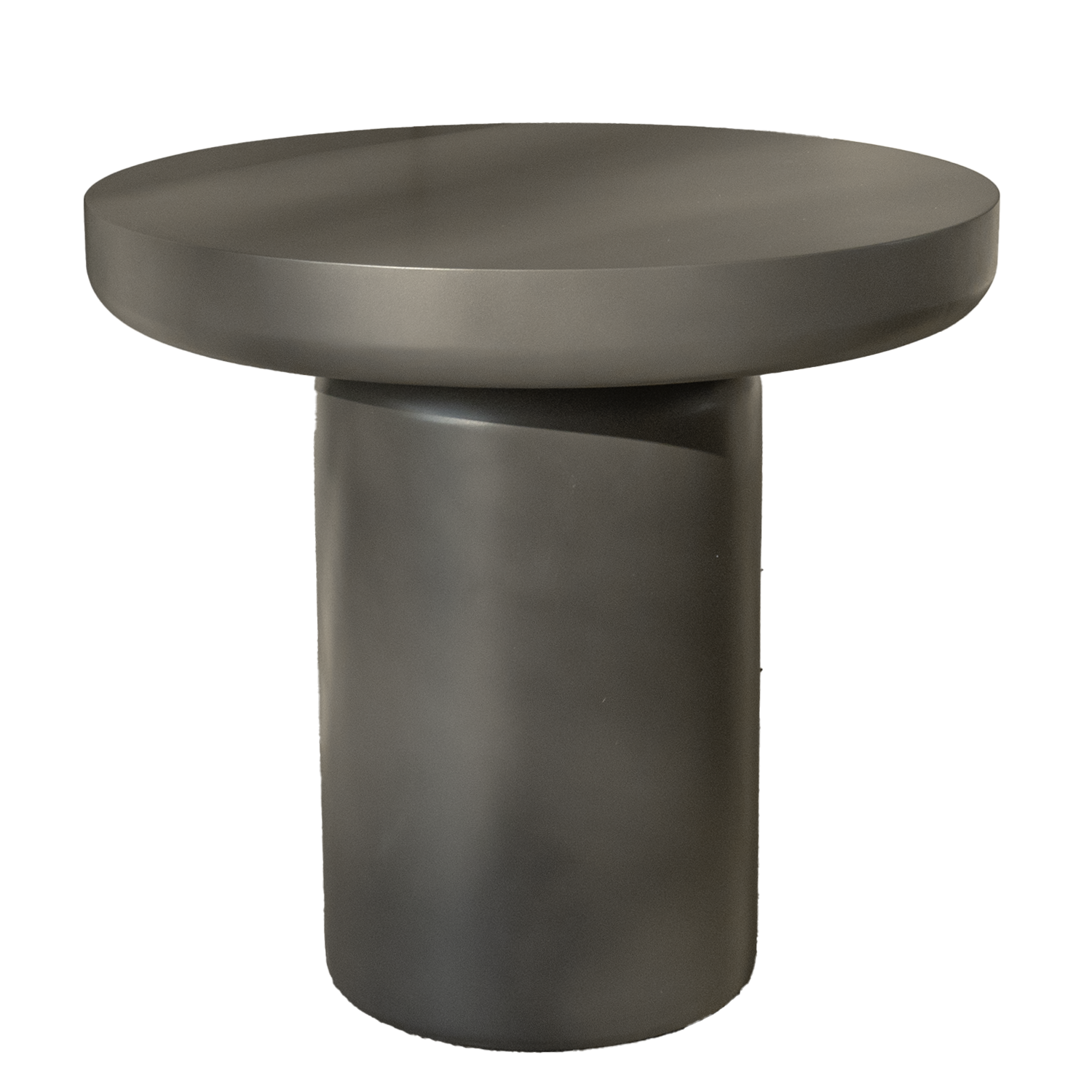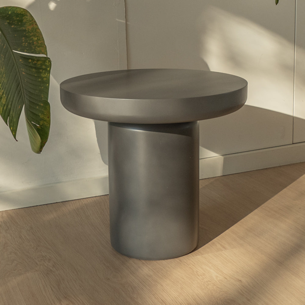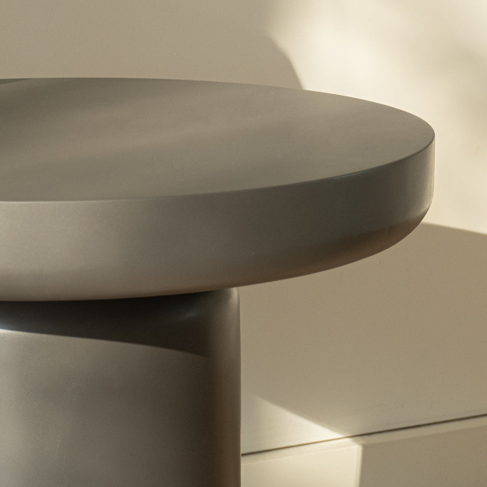 Een compacte en stijlvolle ronde bijzettafel in een neutrale grijze tint. Het minimalistische ontwerp maakt hem een veelzijdige keuze voor diverse interieurstijlen.