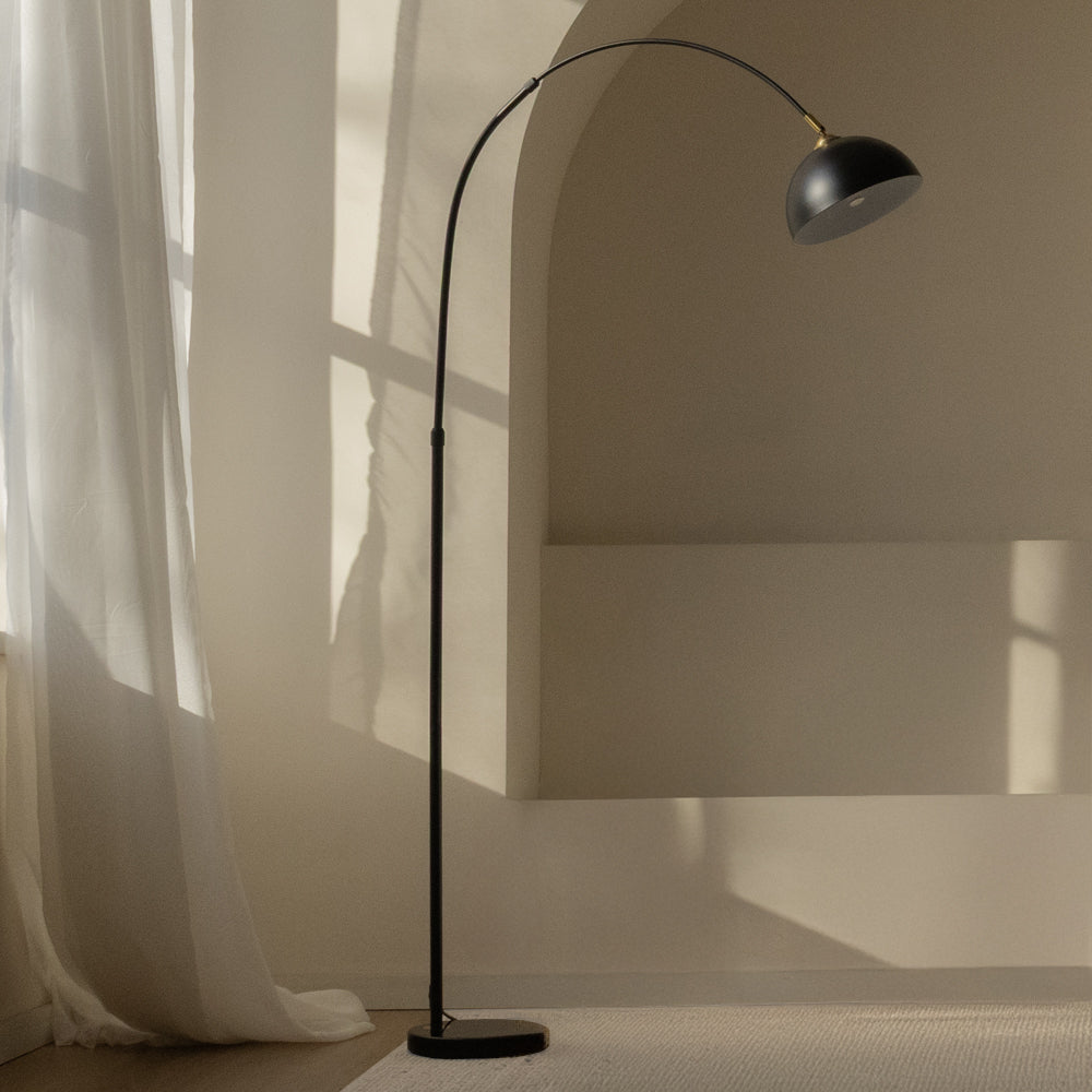 - Zwarte booglamp met bolvormige kap – Minimalistisch, krachtig en een echte blikvanger met zacht diffuus licht.