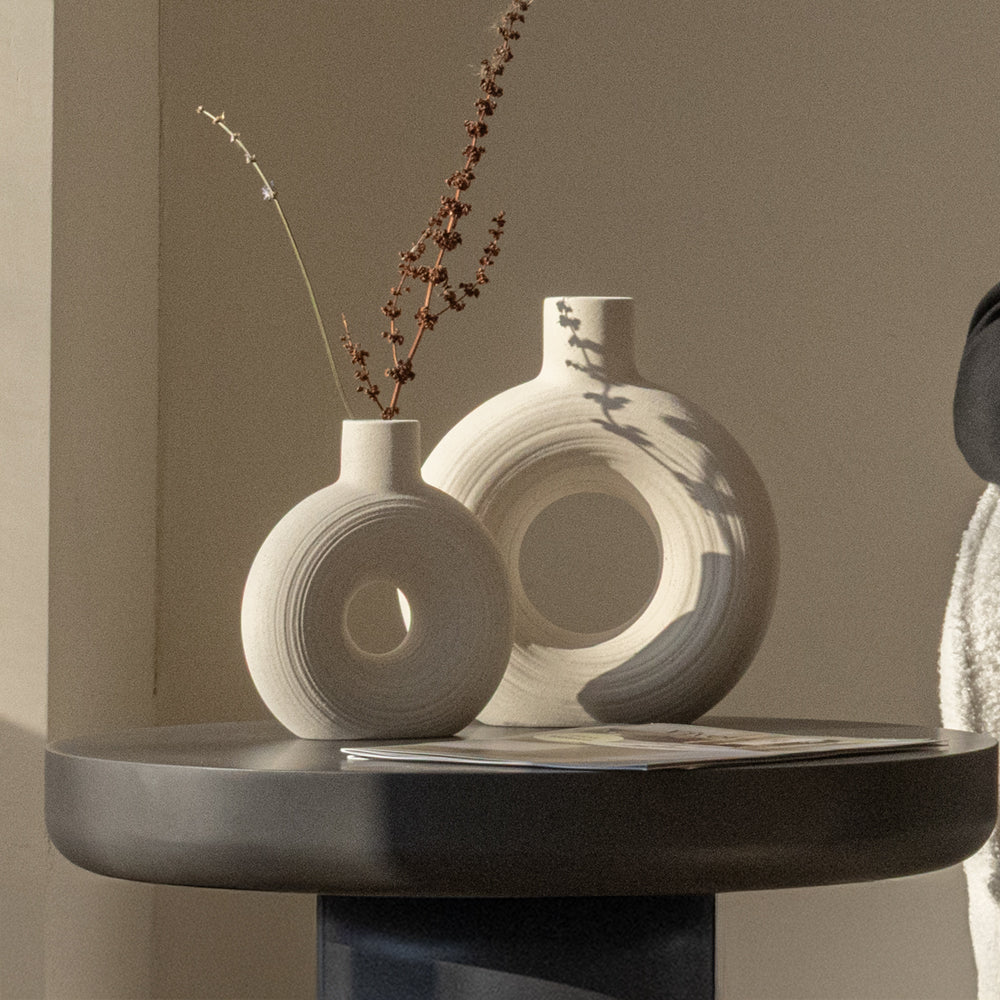 - Set van twee crèmekleurige donut vazen – Organische vormen in mat keramiek, perfect als decoratief accent.