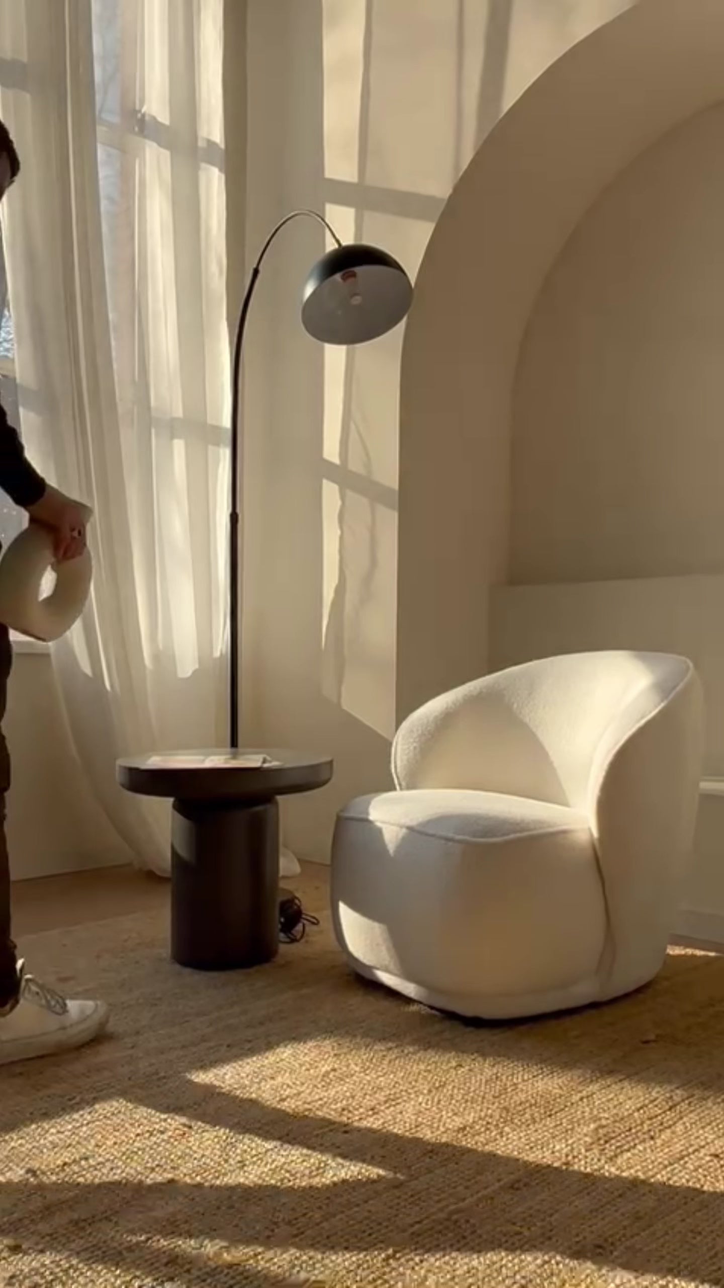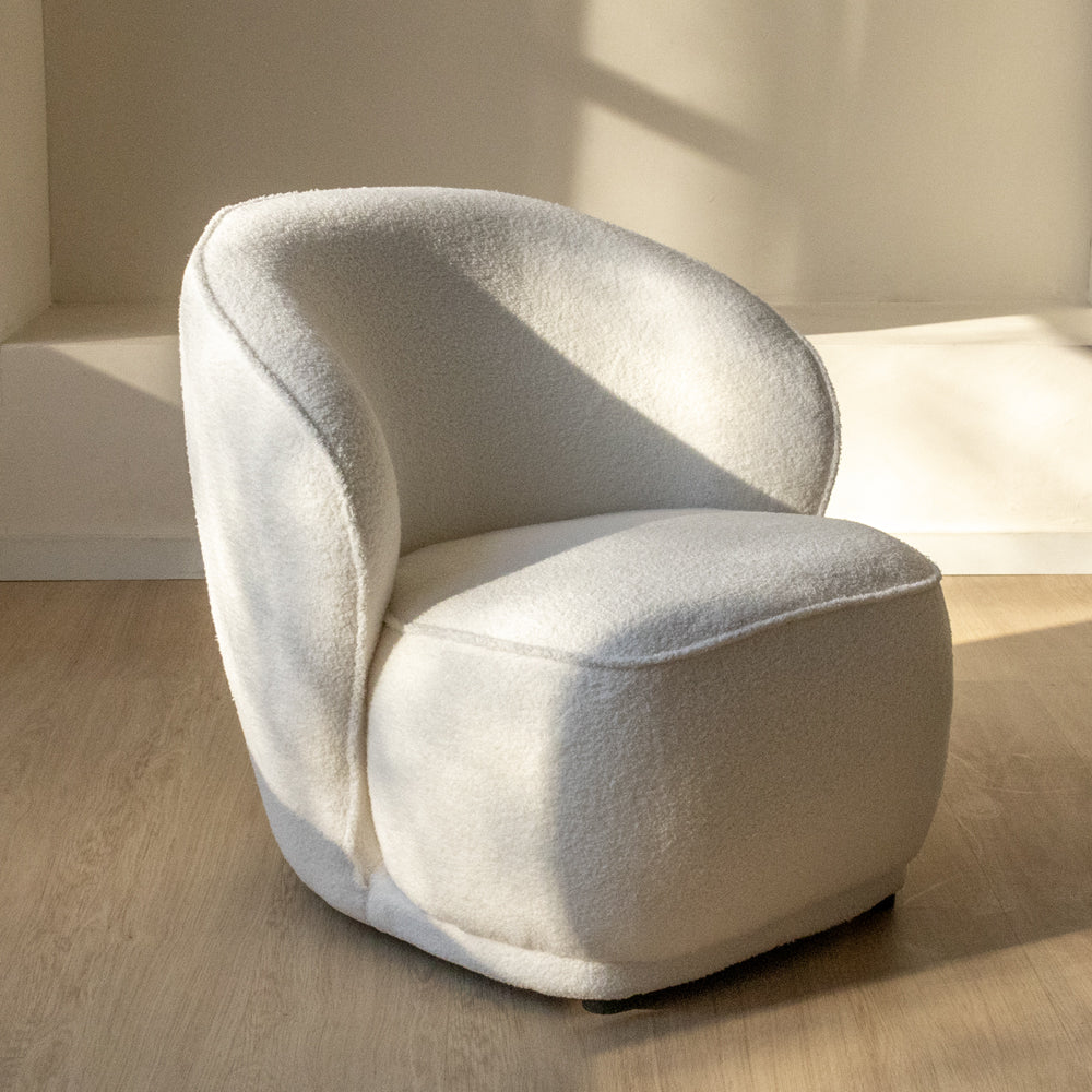 - Witte stoffen loungestoel – Zacht, royaal en uitnodigend met een afgerond silhouet in zachte bouclé stof.